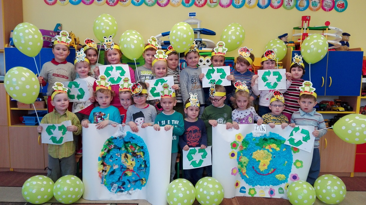 W związku z tym dzieci z Przedszkola w Brzeźnie już od września poznawały zasady segregowania śmieci, nie jest im obce pojęcie recykling, poznały zasady oszczędzania wody i energii. Pierwszym punktem obchodów Dnia Ziemi był konkurs wiedzy ekologicznej. Następnie dzieci wykonały plakaty przedstawiające „Ziemię smutną i wesołą". Zgodnie z naszym przyrzeczeniem: "Kocham ptaki, zieleń, drzewa, wiem - jak o przyrodę dbać trzeba" dzieci złożyły ślubowanie „Przyjaciela Przyrody". Na znak tego, że chcemy, aby nasza planeta była czysta i zielona, dzieci otrzymały balony oraz opaski symbolizujące zwiastuny wiosny.