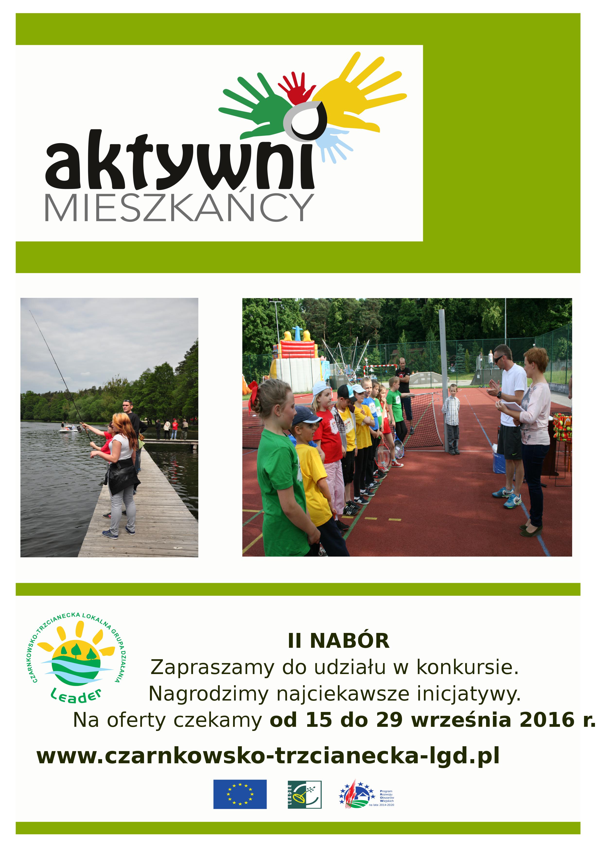 Czarnkowsko - Trzcianecka Lokalna Grupa Działania rusza z kolejną odsłoną konkursu Aktywni Mieszkańcy! Chcesz coś zmienić, poprawić, zorganizować i nie zdążyłeś złożyć oferty w ramach I naboru? Nic straconego! Teraz możesz działać, bo Czarnkowsko - Trzcianecka Lokalna Grupa Działania ogłosiliła kolejny nabór ofert. Pamiętaj - najważniejszy jest pomysł. Rozejrzyj się wokół siebie, obserwuj, poczuj się odpowiedzialny za wspólne dobro – za swoje osiedle, wieś, park, plac zabaw, szkołę, za przestrzeń, w której żyjesz… Może być jeszcze lepiej, ładniej i ciekawiej!
