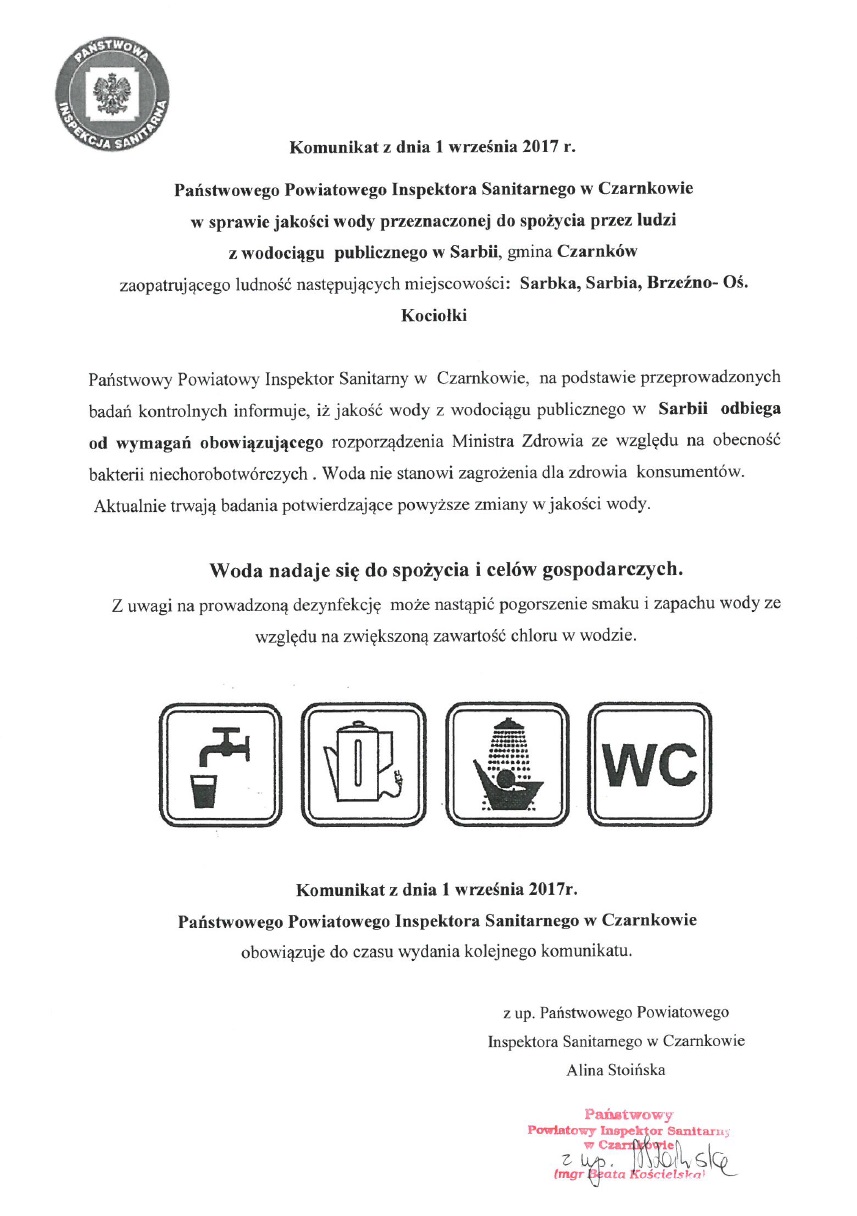 Komunikat Państwowego Powiatowego Inspektora Sanitarnego z dnia 01 września 2017 roku w sprawie wodociągu publicznego w Sarbii