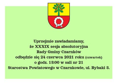 Uprzejmie zawiadamiam, że XXXIX sesja absolutoryjna Rady Gminy Czarnków odbędzie się 24 czerwca 2021 roku (czwartek) o godz. 13:00 w sali nr 21 Starostwa Powiatowego w Czarnkowie, ul. Rybaki 3.