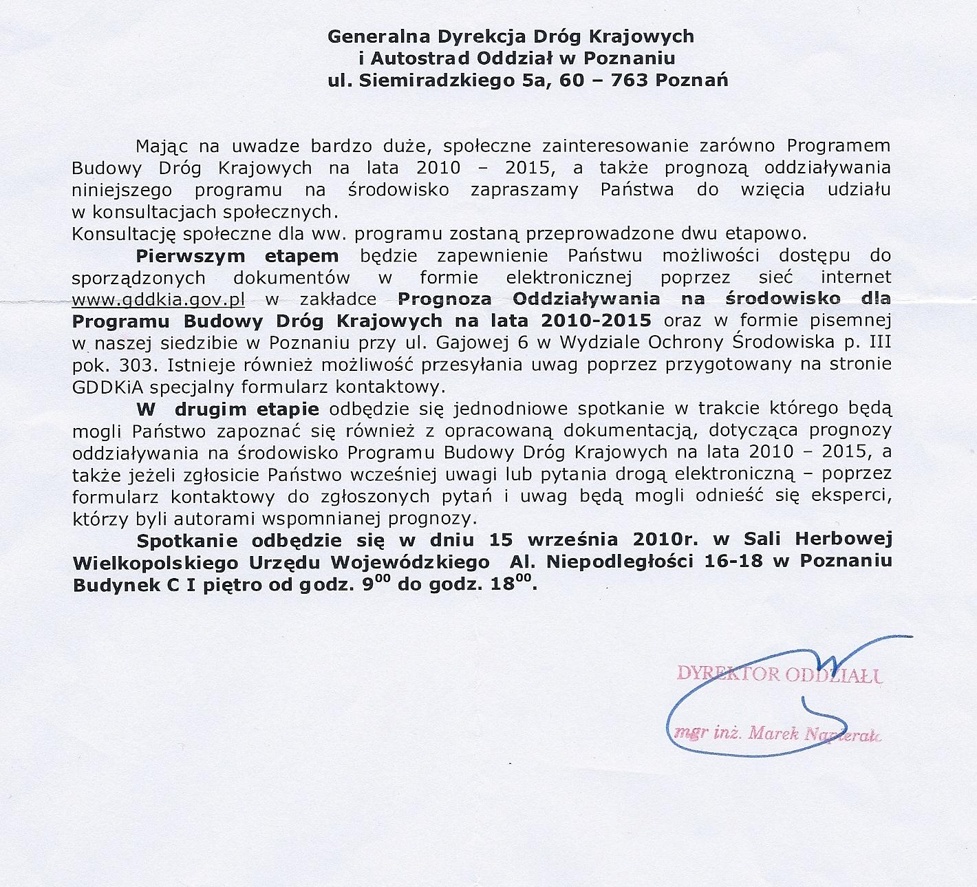 Informacja Generalnej Dyrekcji Dróg Krajowych i Autostrad Oddział w Poznaniu w sprawie konsultacji społecznych dotyczących Programu Budowy Dróg Krajowych na lata 2010 - 2015.