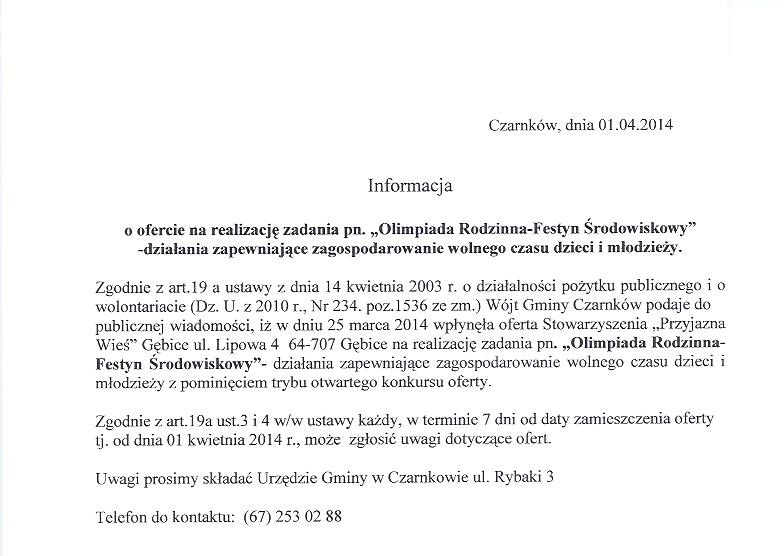 Informacja o ofercie na realizację zadania pn. "Olimpiada Rodzinna-Festyn Środowiskowy"