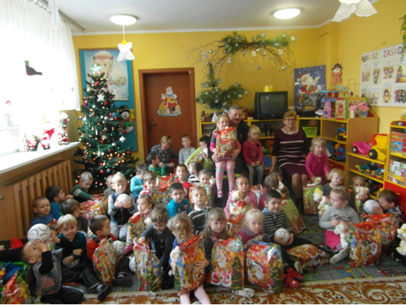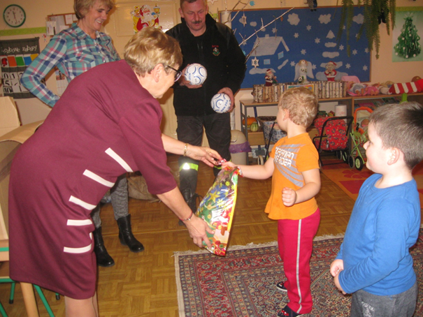 Wszystkie dzieci zostały obdarowane wspaniałymi prezentami- były piłki, czapki i szaliki znanej drużyny piłkarskiej KKS LECH POZNAŃ, zabawki, zestawy plastyczne i słodycze.