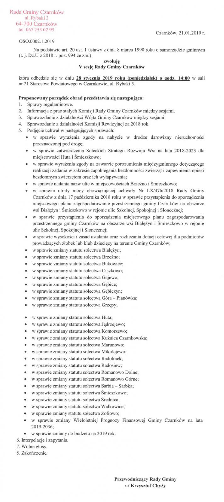 V sesja Rady Gminy Czarnków - 28.01.2019 roku