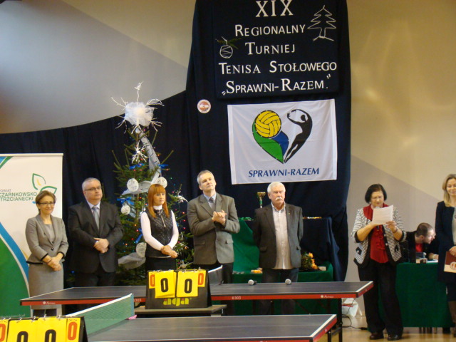 Tenis stołowy jest znaną i lubianą przez młodzież dyscypliną sportową. W tej grze liczy się szybkość reakcji, odpowiednia postawa przy stole i precyzja odbicia piłeczki. Te wszystkie umiejętności zaprezentowali uczniowie-zawodnicy podczas XIX Regionalnego Turnieju Tenisa Stołowego "Sprawni-Razem", który rozegrany został 9 grudnia b.r. w Zespole Szkół Specjalnych im. Kornela Makuszyńskiego w Gębicach. Ta wspaniała cykliczna impreza sfinansowana została przez starostwo powiatowe w Czarnkowie, Gminę Czarnków, Poli-Vet Sp. z o.o. z Czarnkowa i PSS Społem z Czarnkowa. Na otwarcie zawodów przybyli zaproszeni goście: nowy wicestarosta naszego powiatu - Jacek Klimaszewski, naczelnik Wydziału Edukacji - Ryszard Jabłonowski, główna specjalistka ds. sportu i współpracy samorządowej - Wioletta Szukajło, prezes Związku Stowarzyszeń Społeczno-Sportowych "Sprawni-Razem" w Pile - Aleksandra Błażejewska i wiceprezes tego Stowarzyszenia - Jerzy Kucharski. Gościem specjalnym była pani posłanka na Sejm Rzeczypospolitej Polskiej - Maria Małgorzata Janyska, która odebrała z rąk Aleksandry Błażejewskiej Kryształowe Serce: najwyższe wyróżnienie przyznawane przez Związek. To honorowe odznaczenie zostało przyznane pani poseł m.in. za pomoc w zorganizowaniu środków finansowych z Ministerstwa Sportu na wyjazd piłkarskiej Reprezentacji Polski "Sprawni-Razem" na Mundial do Brazylii.