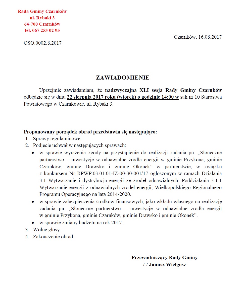 XLI Sesja Rady Gminy Czarnków - 22 sierpnia 2017 roku